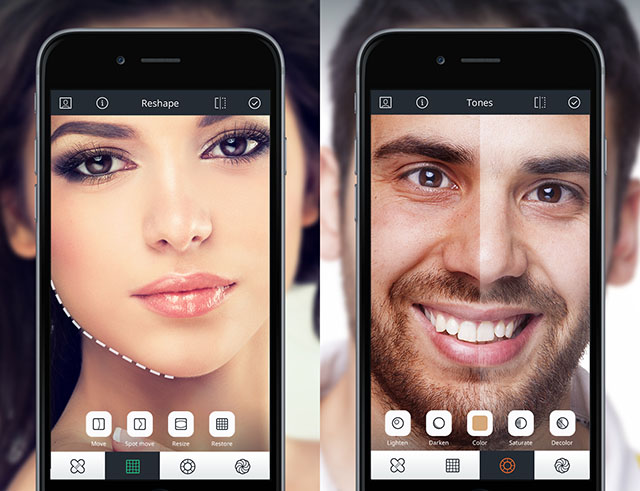 Инструменты, предлагаемые приложением, включают в себя: Soft clone, Reshape, Tones, Looks (набор пресетов), Spot heal, Teeth, Clarity, Clone, Redness, Lighten/Darken и другие.